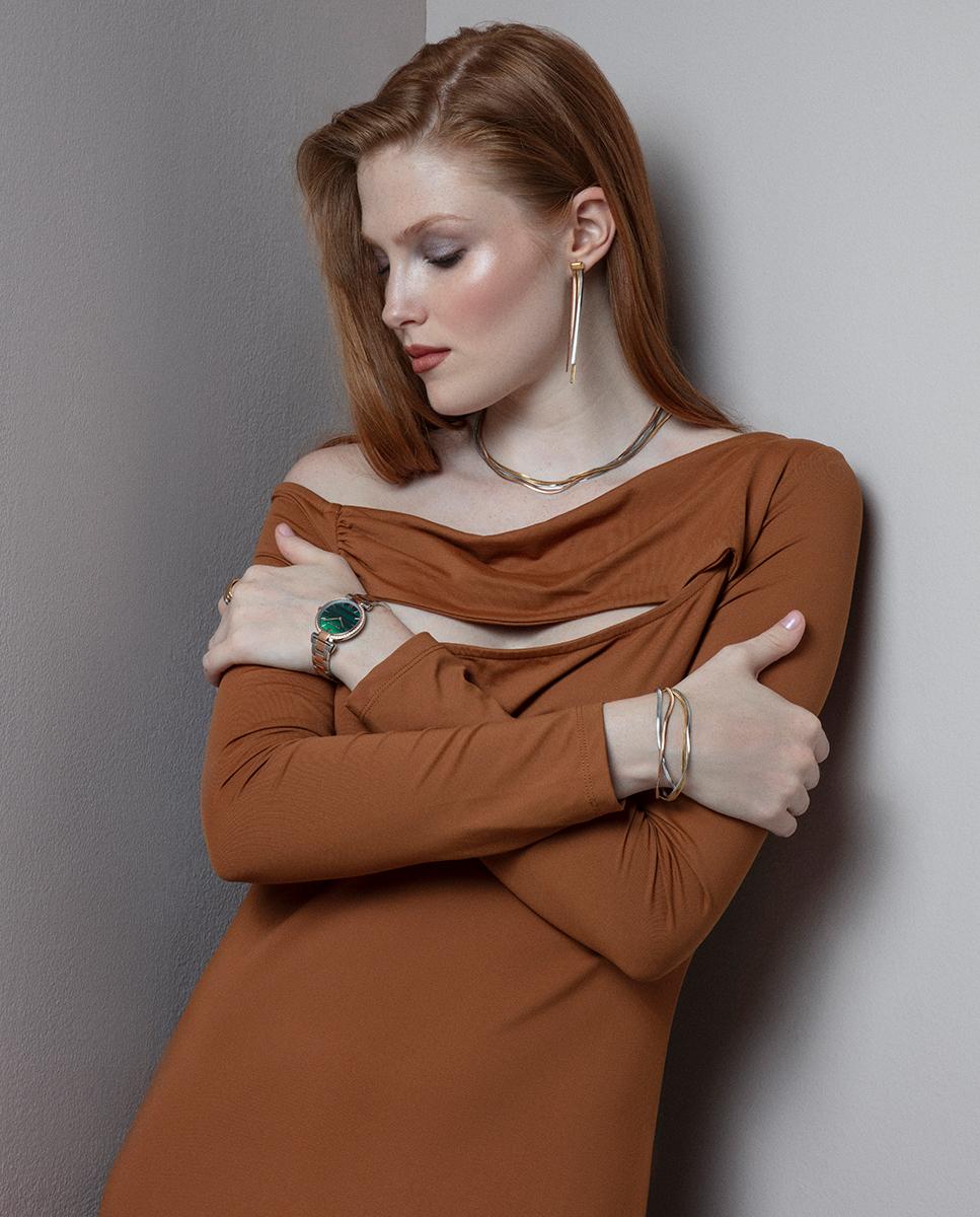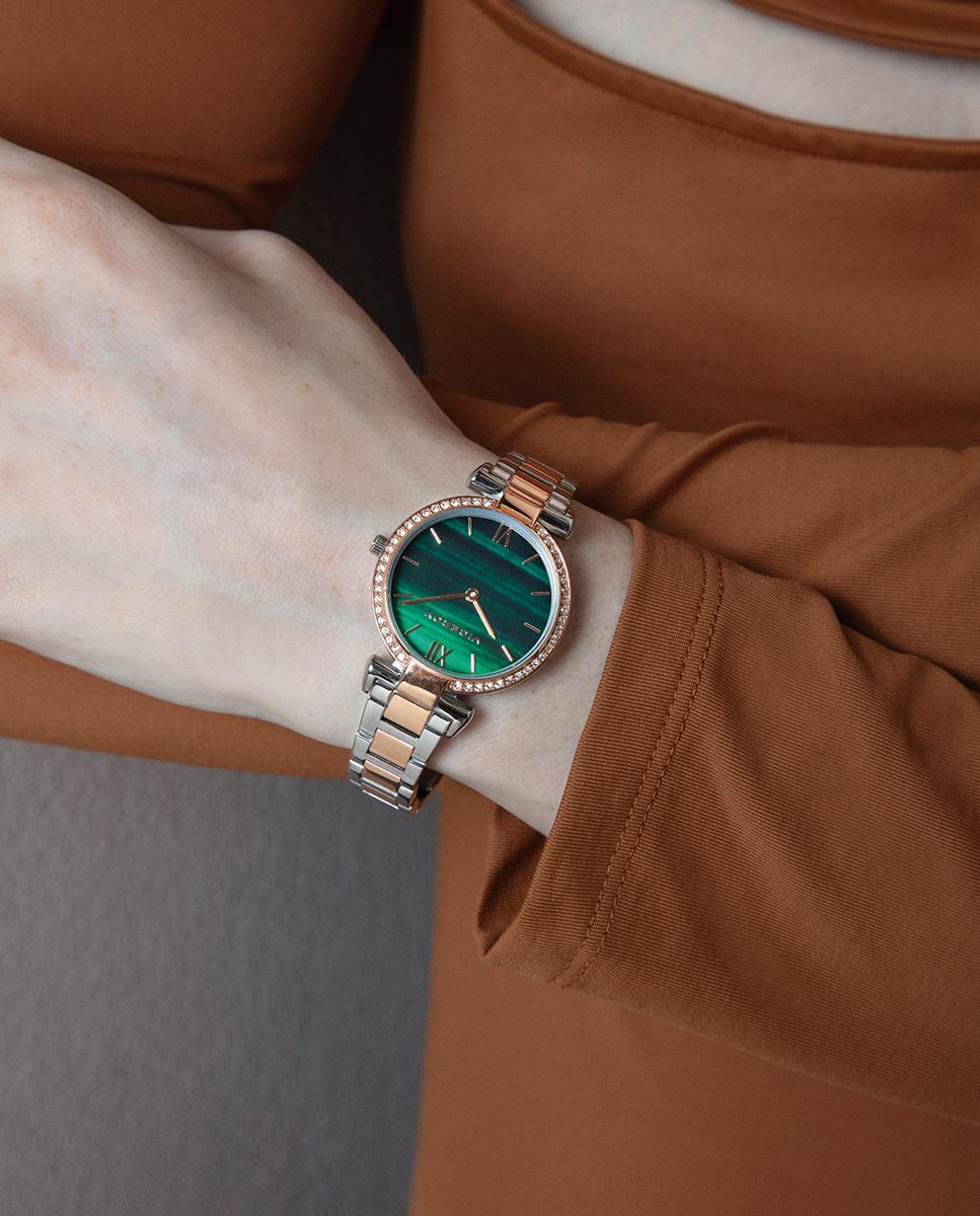 El brazalete bicolor de acero con IP rosa complementa la esfera verde, que presenta índices y agujas horarias en color rosa, añadiendo un contraste sutil y sofisticado.