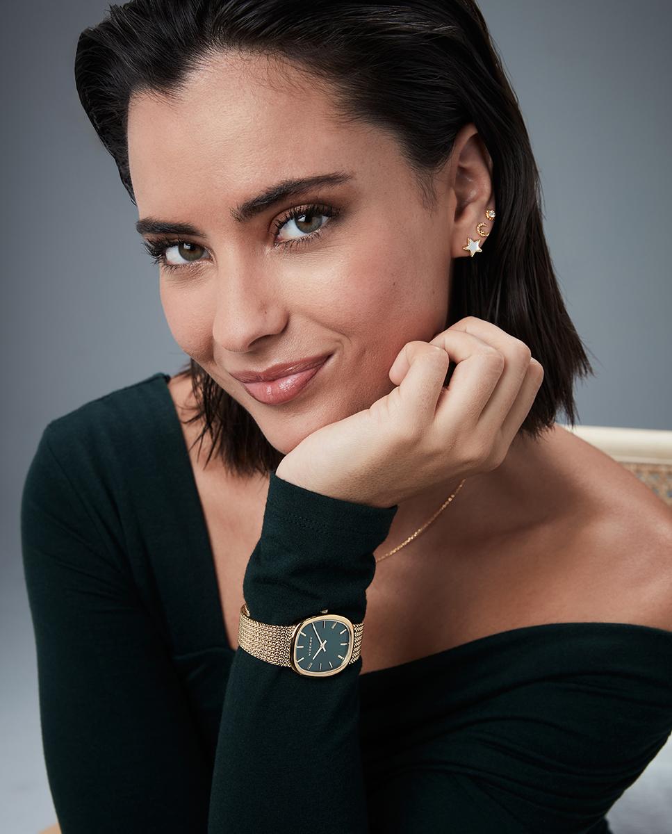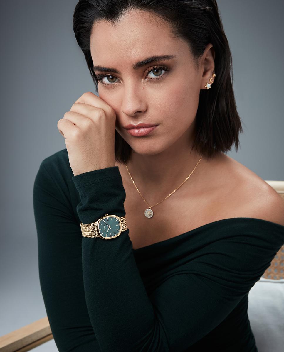 Elegante reloj de mujer de dos agujas con caja y malla milanesa de acero Ip dorado, diseñado para quienes buscan sofisticación y estilo. Su esfera verde resalta con índices precisos y agujas horarias en color Ip dorado, protegida por cristal mineral resistente.