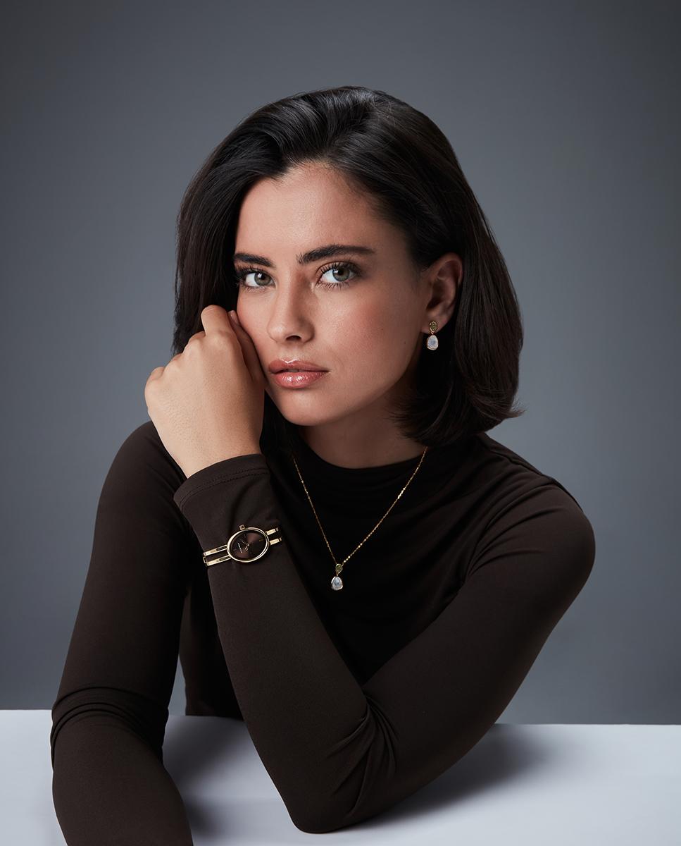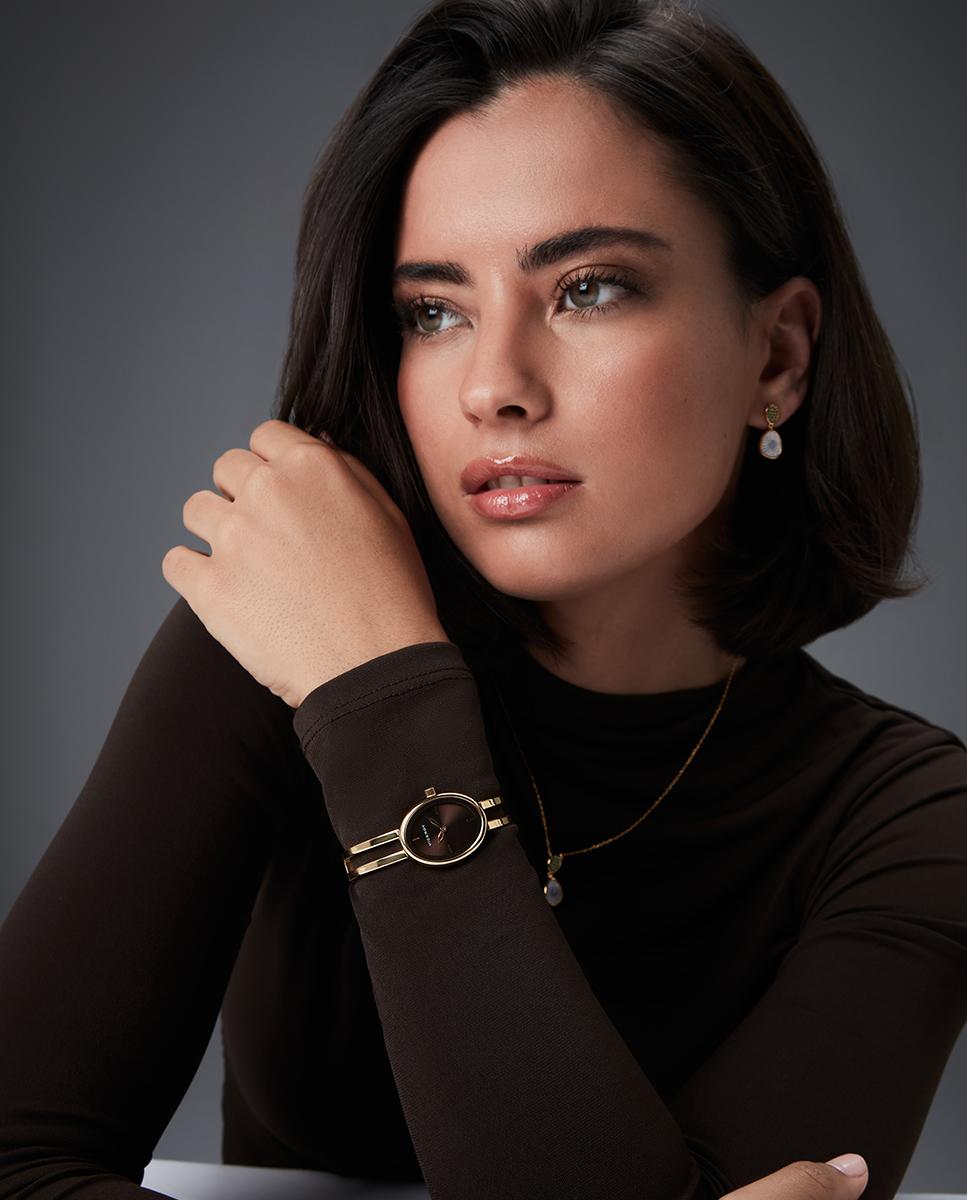 Estilo sofisticado en dos agujas con caja y brazalete de acero Ip dorado, combinando a la perfección con la esfera marrón. Los índices y las agujas en dorado realzan la elegancia, mientras el cristal mineral protege la pieza con durabilidad y claridad.