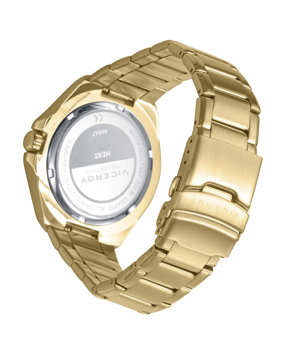 Con un diseño que combina resistencia y estilo, este reloj masculino de tres agujas con calendario presenta caja bitono de acero Ip dorado y azul 20 ATM, brazalete de acero Ip dorado y esfera azul con índices legibles.