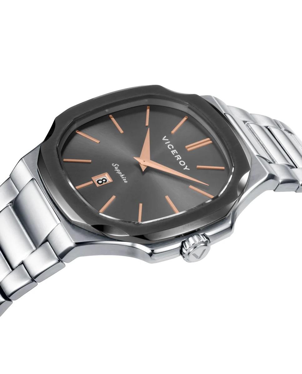 Reloj Viceroy colección Laura Escanes para hombre en acero caja extraplana con bisel fino y elegante gris forma octogonal. Esfera en gris con índices y agujas en rosa, calendario en la posición de las seis.